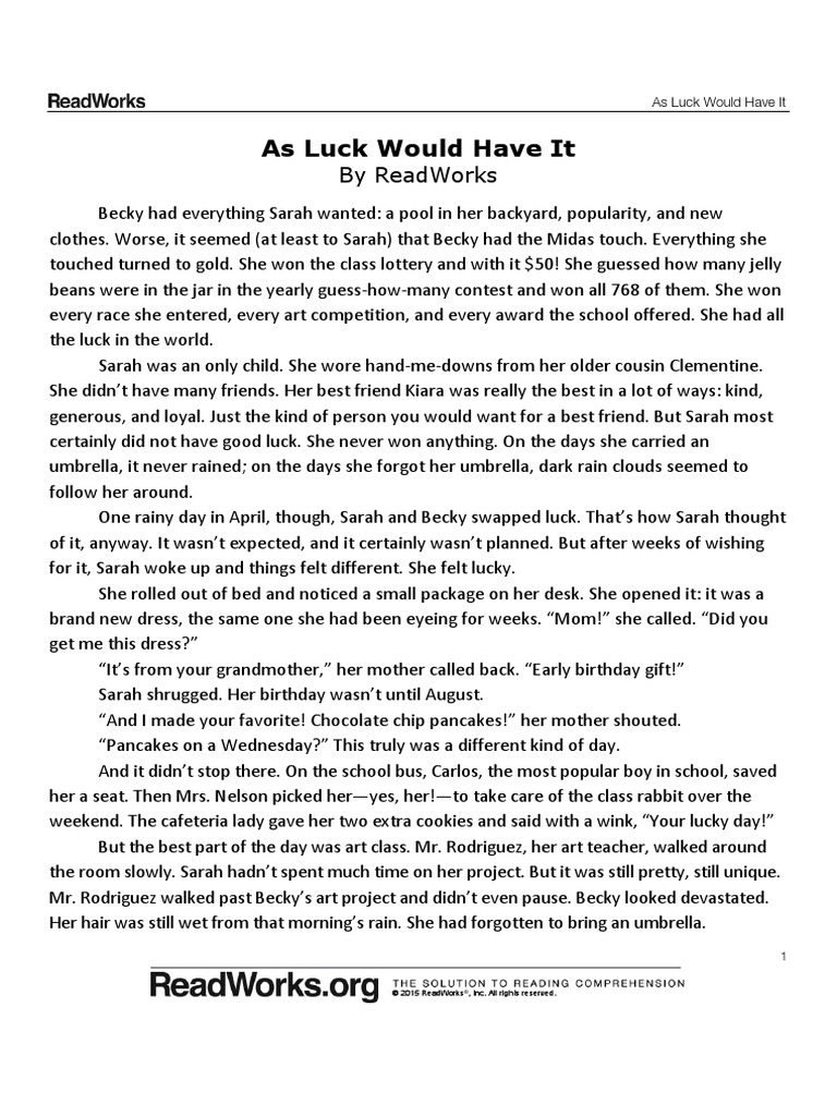 As Luck Would Have It 500 Passage And Questions Pdf Pdf Luck